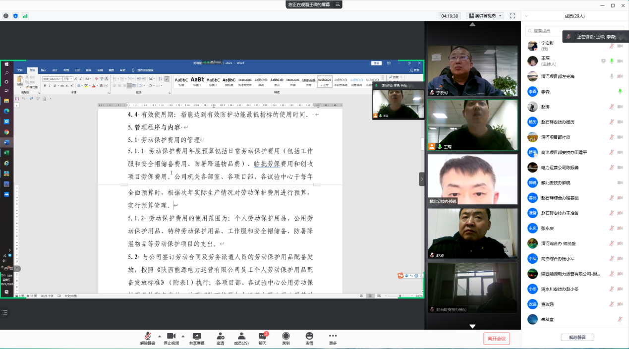 近日,安全监察部通过网络视频形式召开了公司安全管理制度宣贯会议,对各项目部、电力试验研究中心相关管理人员进行《劳动保护管理制度》《安全环保工作奖惩规定》及《集团公司注册安全工程师管理办法》等安全制度宣贯,详细解答了参会人员提出的问题,记录大家提出的建议和意见以备后期修订完善。