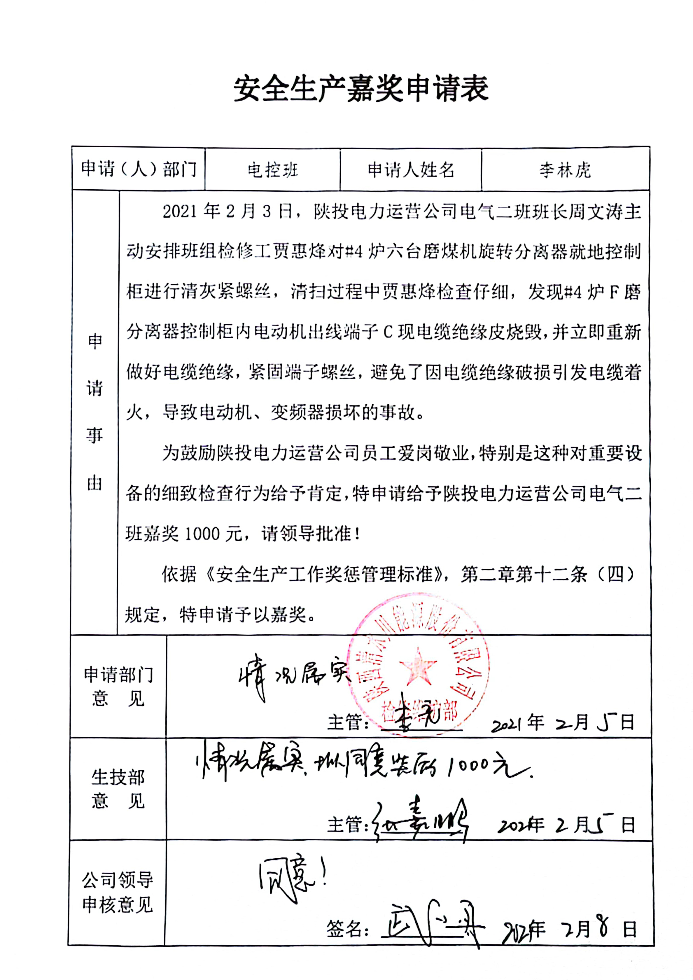 2月3日,电气专业贾惠烽、强月龙在持票检查#4炉F磨分离器控制柜时,发现柜内电动机出线端子C相电缆绝缘皮烧毁,立即逐级上报并重新恢复电缆绝缘,紧固端子螺丝,全面检查确保柜内其他回路完好无损,避免了因绝缘破损引发磨煤机分离器控制柜着火及磨煤机电动机、变频器损坏等影响机组安全运行的重大事故。
