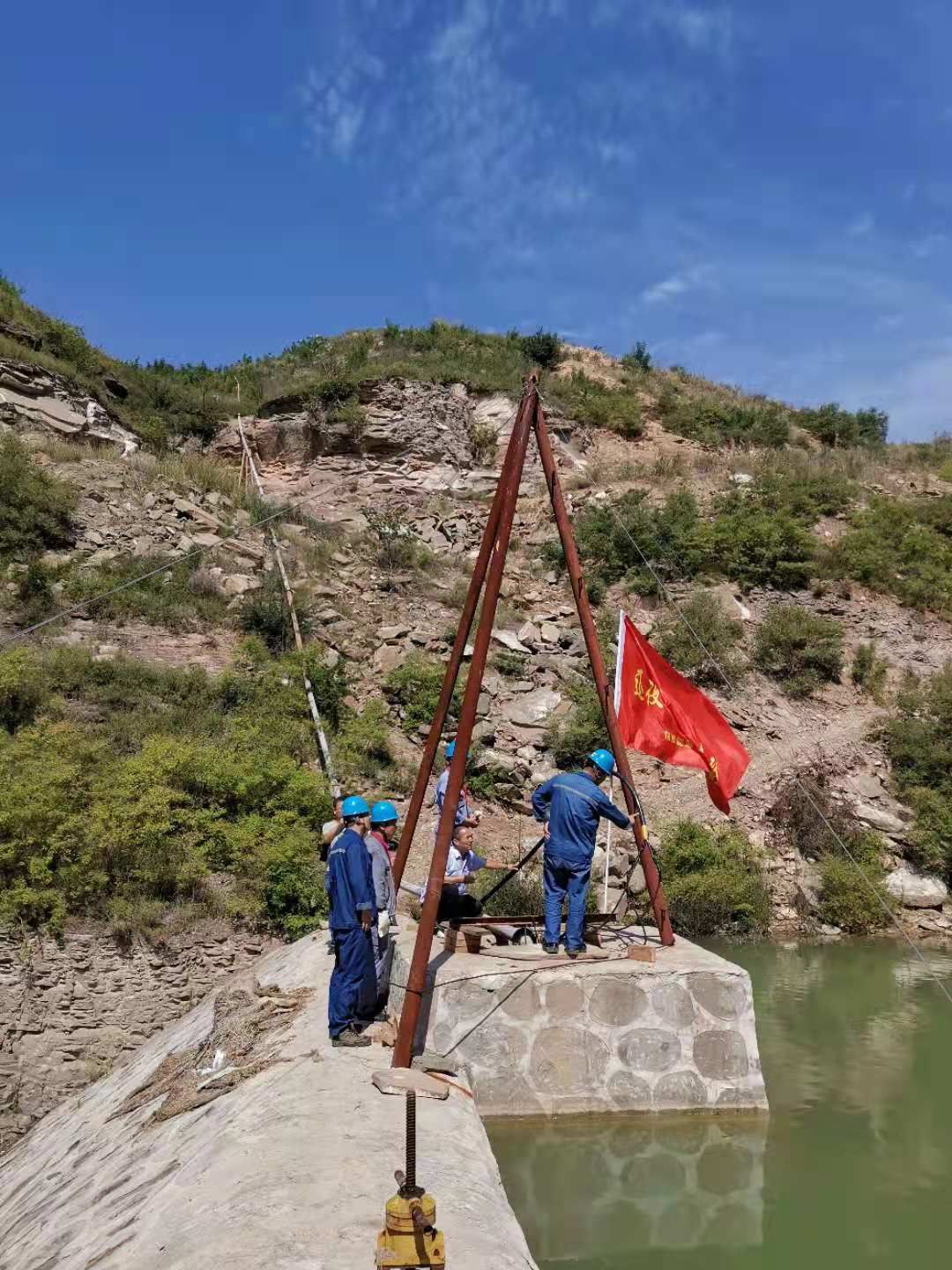 到了沟底,查设备,巡线路,找问题,队员们马不停蹄投入抢修工作。头顶着火辣辣的太阳,眼前虽是一汪碧水,可沟里一丝风也没有,温度超过40℃。人站在河坝上即使不干活,一会儿就汗流浃背,头晕目眩。工作中,大家不时抹一把脸上、身上的汗,开玩笑说:“鱼在下面的河水里游泳,我们在岸上的汗水里游泳。”可为了打通这条关乎全村的“生命线”,大家临深渊,没有一个人临阵退缩;涉险滩,始终没有一句怨言。