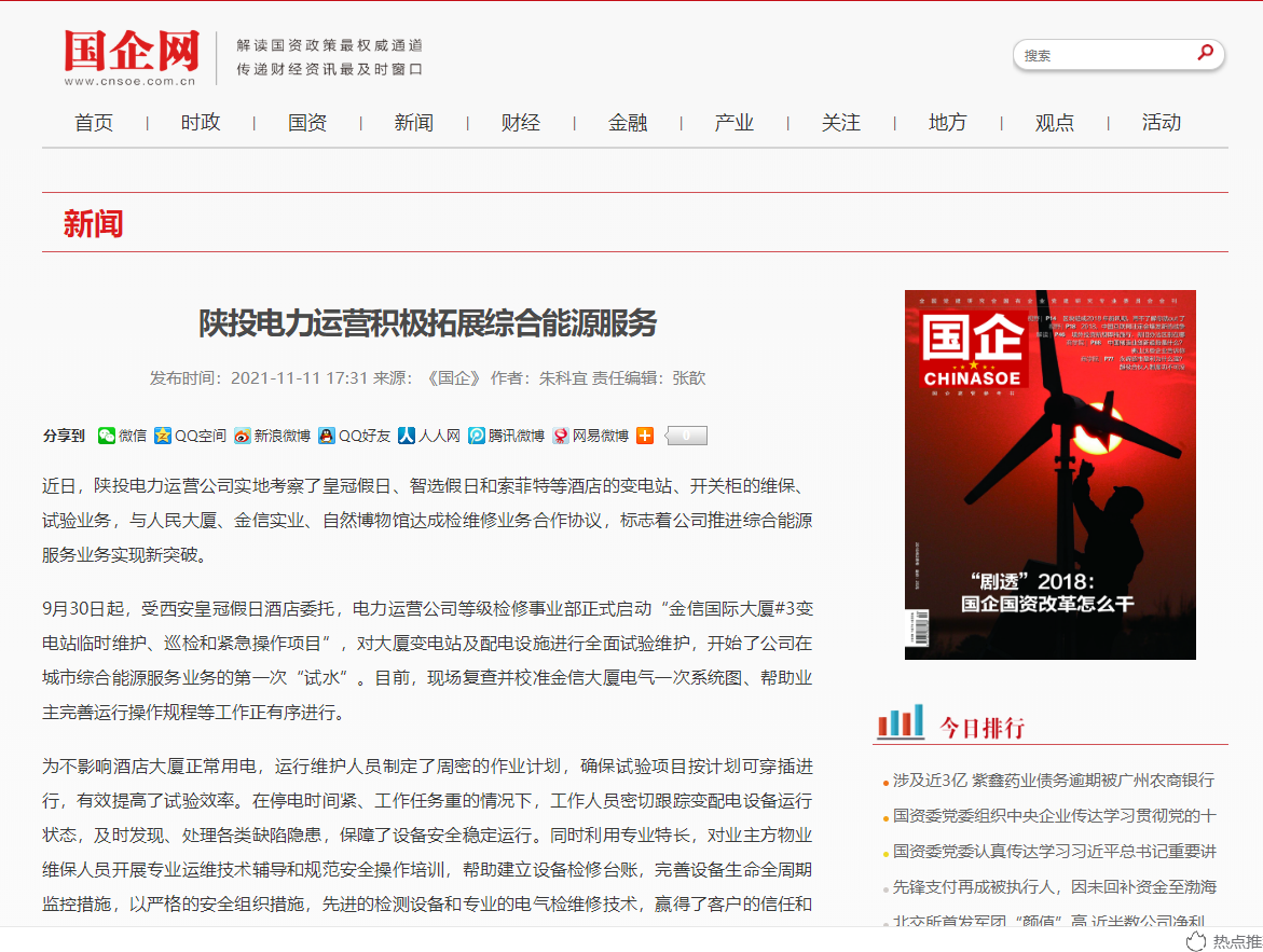 9月30日起,受西安皇冠假日酒店委托,公司等级检修事业部正式启动“金信国际大厦#3变电站临时维护、巡检和紧急操作项目”,对大厦变电站及配电设施进行全面试验维护,开始了公司在城市综合能源服务业务的第一次“试水”。目前,现场复查并校准金信大厦电气一次系统图、帮助业主完善运行操作规程等工作正有序进行。