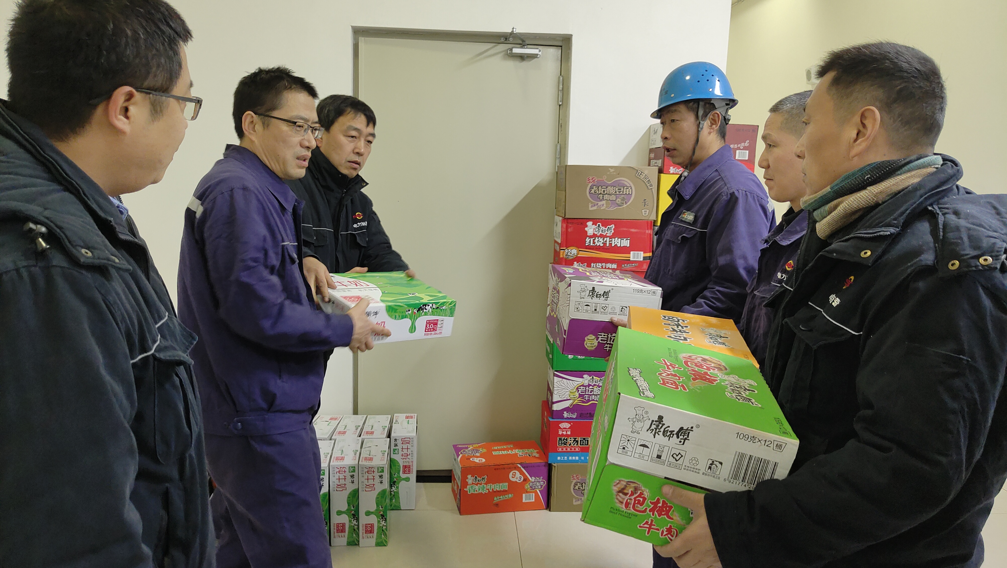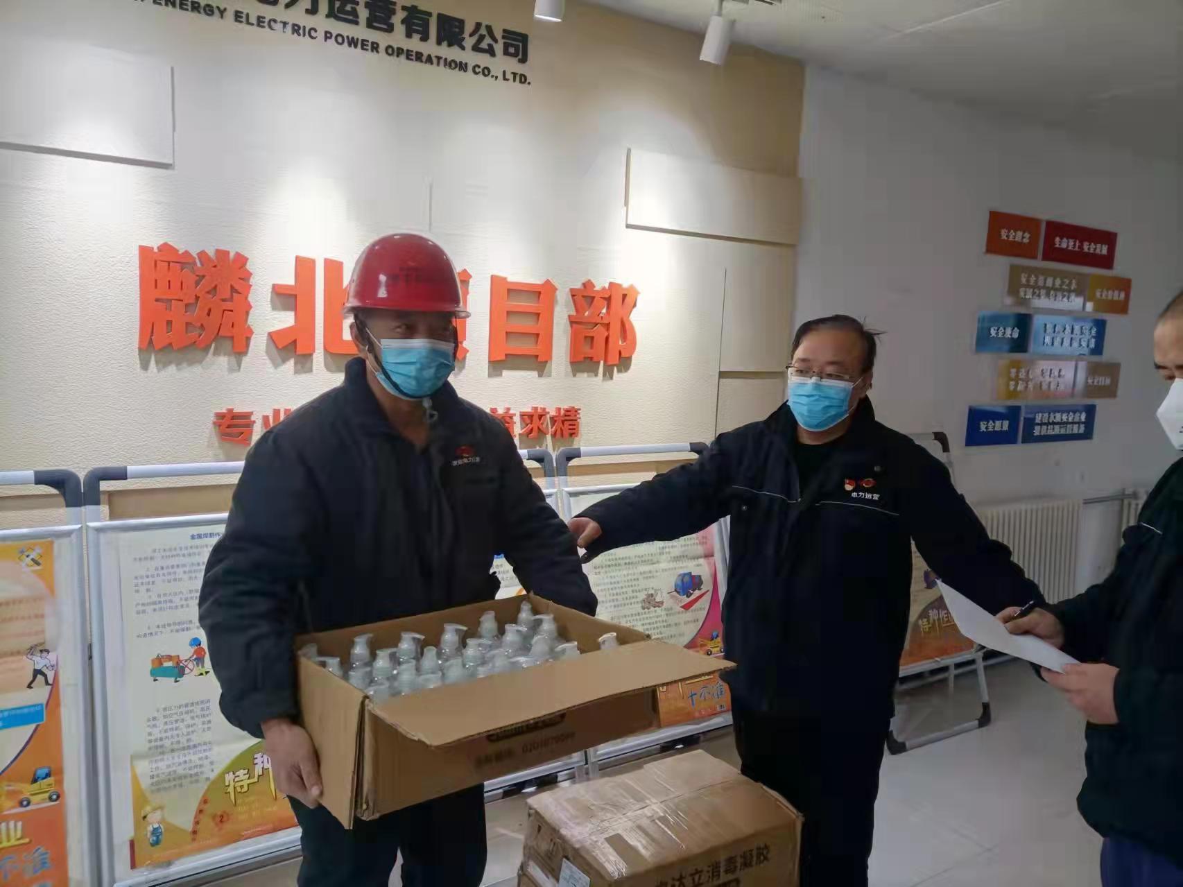 麟北项目部党支部多处联系搜集资源,购买到了消毒洗手液及方便面等物资,慰问坚守在疫情防控、供热保电的一线班组员工。