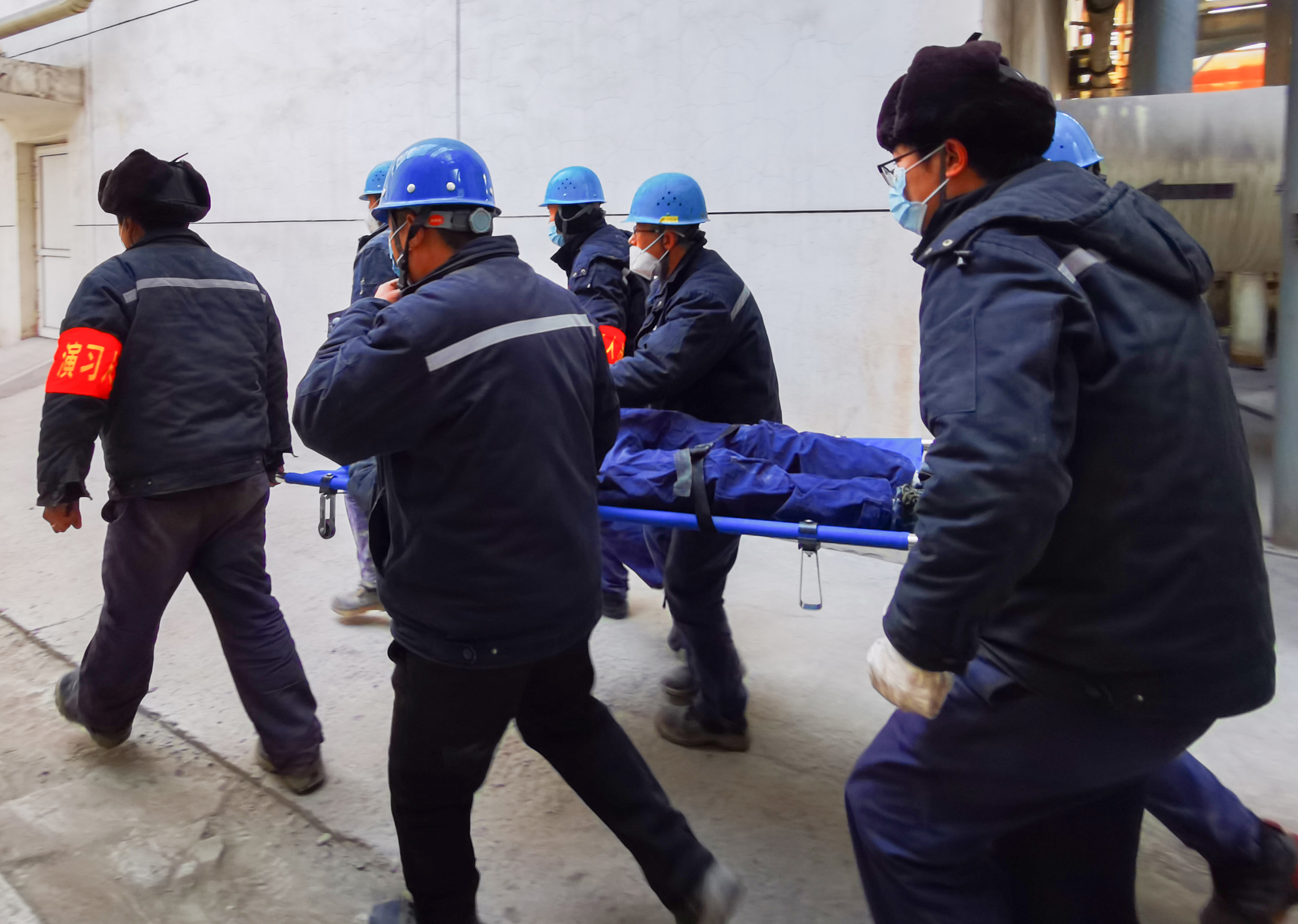 演练模拟吸收塔发生高处坠落事故,现场带班人员发现险情后,立即封锁现场,第一时间向上级报告情况。应急演练小组抵达现场后,对事故区域进行警戒,及时疏散现场围观人员,在查明伤者情况后,对伤者进行现场急救,并送往指定医院接受进一步检查和救治。