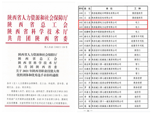本次荣获“陕西省技术能手”的舒文通、屈晓言就是在公司职工技能大赛中涌现出的优秀青年技能人才。他们曾在集团2021年职工职业技能大赛中,荣获电工技能竞赛冠、亚军。