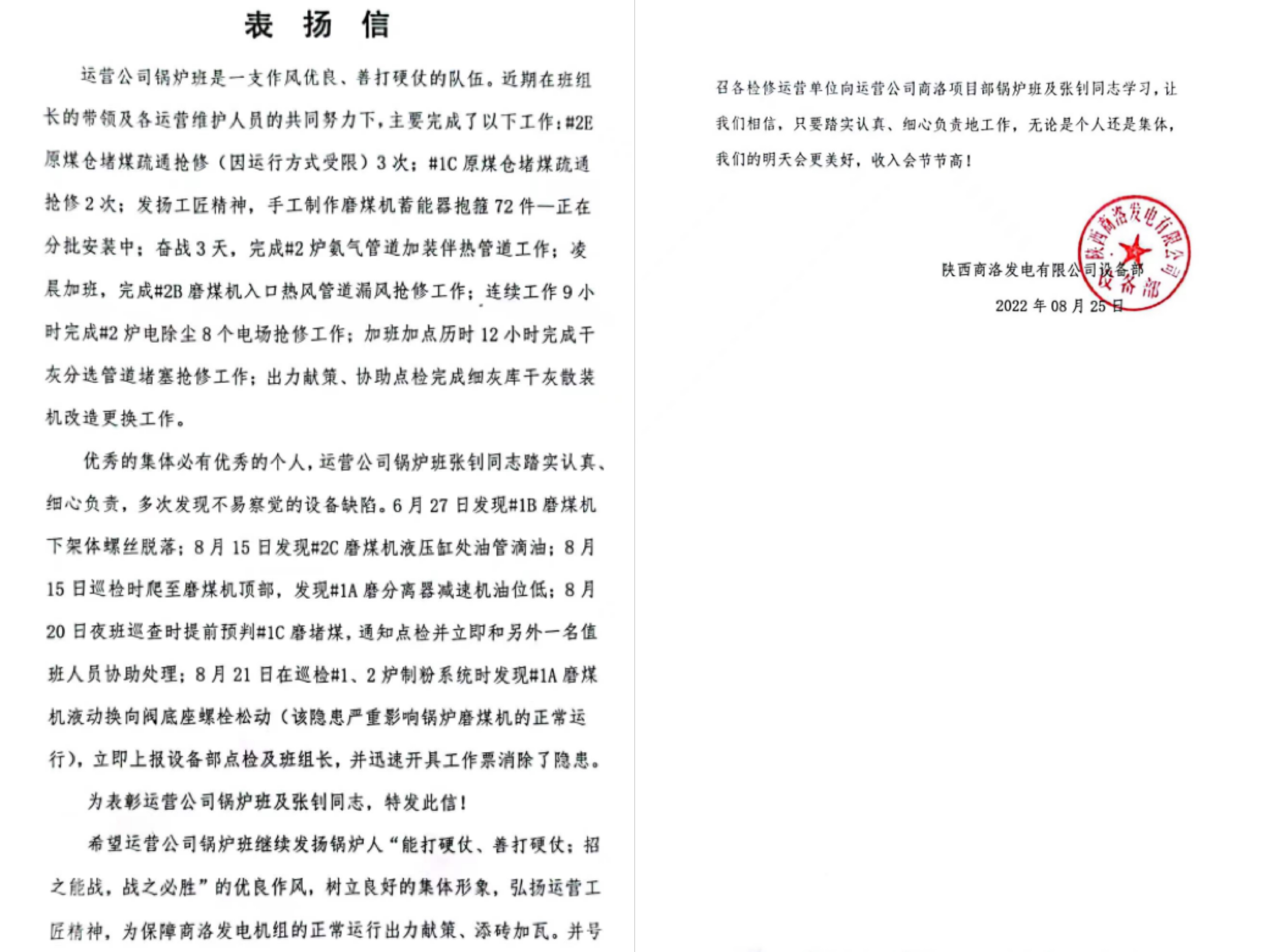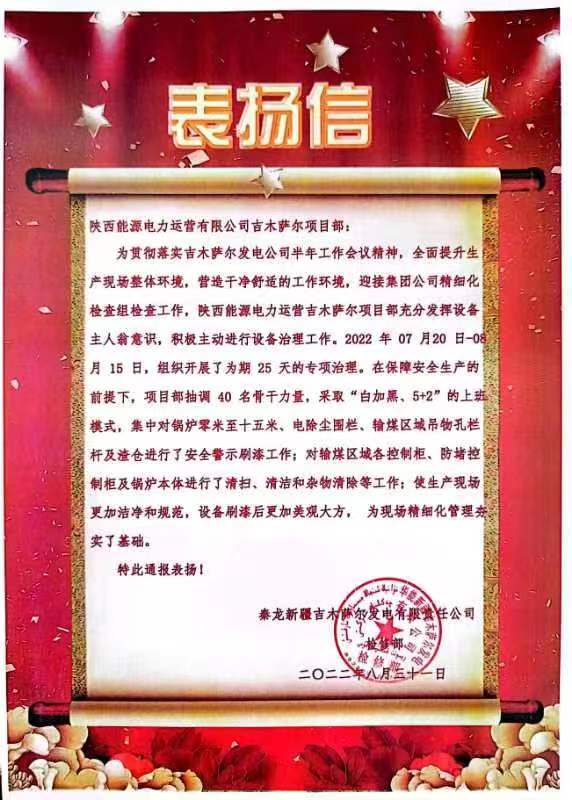 9月1日,公司相继收到吉木萨尔发电检修部、商洛发电设备部发来的表扬信,对吉木萨尔项目部高效优质完成为期25天的设备专项治理和商洛项目部锅炉班加班加点完成抢修表示感谢。