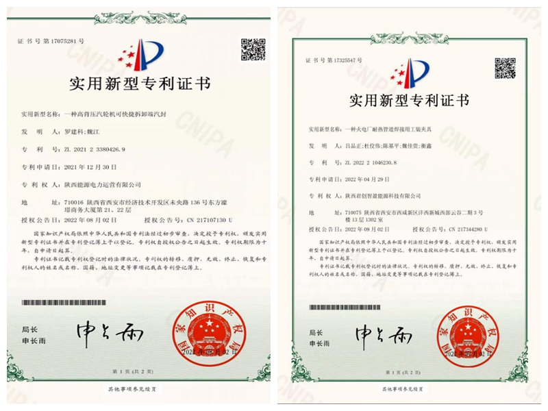 日前,公司“一种火电厂耐热管道焊接用工装夹具”、君创科技“一种高背压汽轮机可快捷拆卸端汽封”获得国家实用新型专利授权。截止目前,公司共获取22项国家实用新型专利授权,并在实际工作中陆续推广。