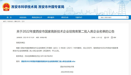 近日,西安市科学技术局发布了2022年度西安市国家高新技术企业培育库第二批入库企业名单,君创科技成功入选,入库编号GQPY2022004751。