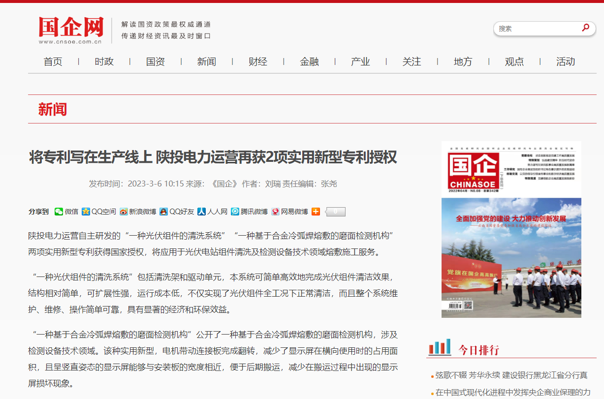 电力运营自主研发的“一种光伏组件的清洗系统”“一种基于合金冷弧焊熔敷的磨面检测机构”两项实用新型专利获得国家授权,将应用于光伏电站组件清洗及检测设备技术领域熔敷施工服务。