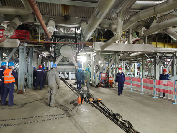 本次所吊运的冷渣器重40余吨,长12米,高3米,对这个又高、又长、又重的“大家伙”来说,锅炉房0米场地显得尤为狭小。为将它顺利请到吊装位置,吊运小组先后割除了主消防母管、水冷壁下集箱给水管等多个管道。因空间狭小无法使用大型起吊设备和常规起吊方法,吊运小组使用“滚杠”+“倒链”的方法,一点点将它往里移动,期间多次调整转向。重量大、到货晚致使工期紧张,工作人员轮流“拉纤”,将冷渣器一步步送到指定起吊位置。