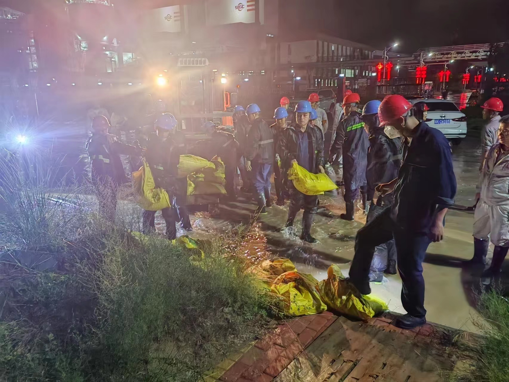 下午18时许,狂风大作,天空下起小雨。值班和管理人员立即开始巡查。21:30,大雨滂沱,防汛应急人员全员进入现场抢险。此时,检修楼前路面积水成河,雨水已没过了脚面。由于雨量过大,全厂的雨水都汇聚到了西门外,排水渠的积水也越来越深,甚至有倒灌回厂区的情况发生。抢险人员立即清理排水渠内杂物,确保排水通畅。搬运沙袋围档堵住西门通道,形成防洪堤坝,防止雨水倒灌。在项目部有序组织协调下,汛情快速得到控制。