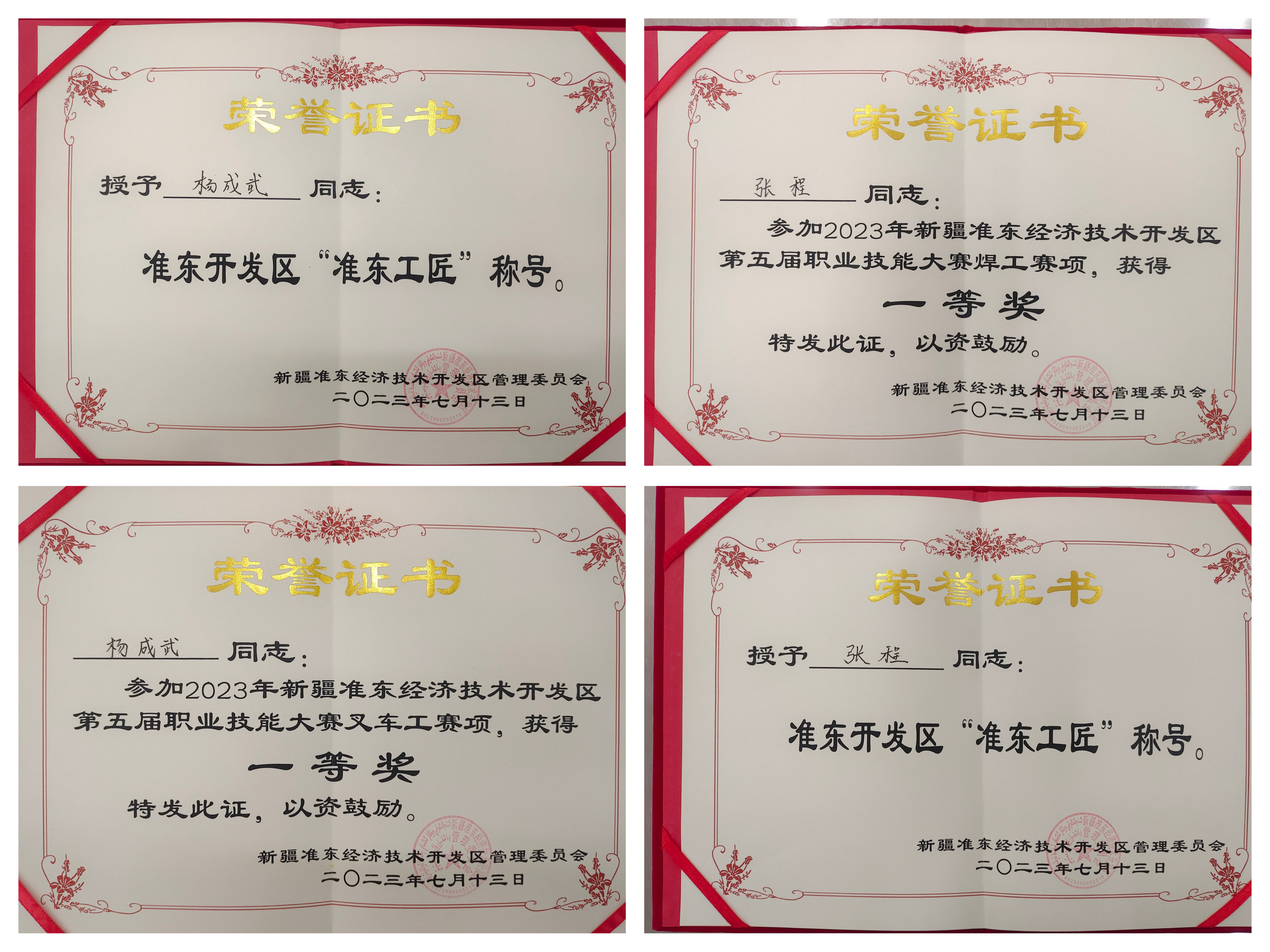 继6月2日吉木萨尔项目部青工张程荣获昌吉州2023年度“青年安全生产示范岗”荣誉称号后,项目部又传喜讯,7月13日,在新疆准东国家经济技术开发区第五届职业技能大赛中,杨成武、张程分别夺得叉车、焊工组比赛第一名,并获准东开发区“准东工匠”荣誉称号。