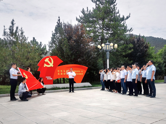 在马栏革命纪念馆广场,全体党员面对鲜红的党旗庄严肃立,高举右拳重温入党誓词。随后,机关支部向7月入党的党员送上“政治生日”纪念卡,引导党员干部牢记入党初心,汲取奋进力量。