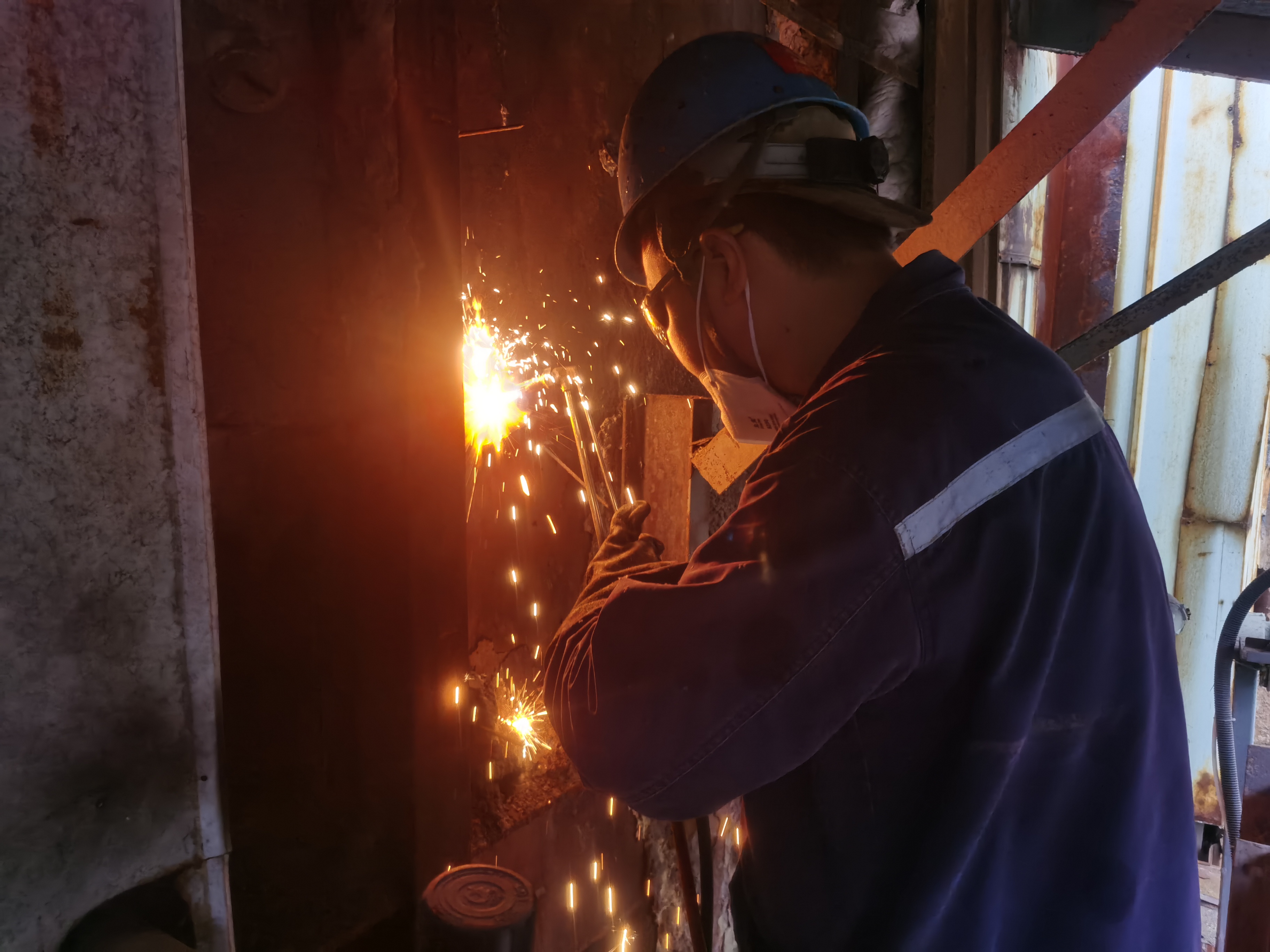 焊工于明面对的是#6炉吸送风机电频开式水管道改造工作,焊口多达40多个,丝毫不敢马虎。焊口距离地面只有15公分左右,作业空间狭窄,他只能躺在潮湿的地面,手执焊枪歪着脖子仰焊。电焊产生的强光刺激着他的眼睛,焊花直往脖子里钻,他全然顾不了这些,一焊就是几个小时。焊花飞溅间,一个个精巧的焊缝完美呈现。焊工需要和各专业配合,无论何时何地,他都随叫随到,从来没有一句怨言。