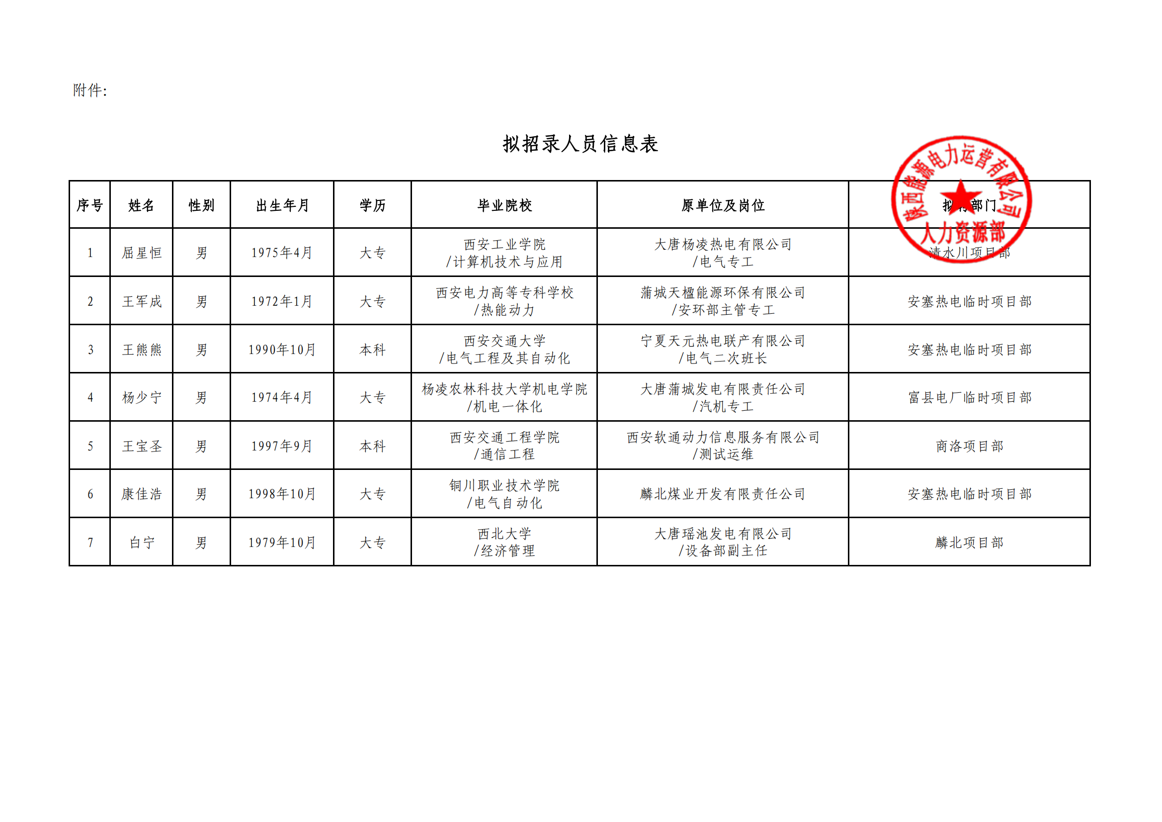关于拟招录屈星恒等7人的公示