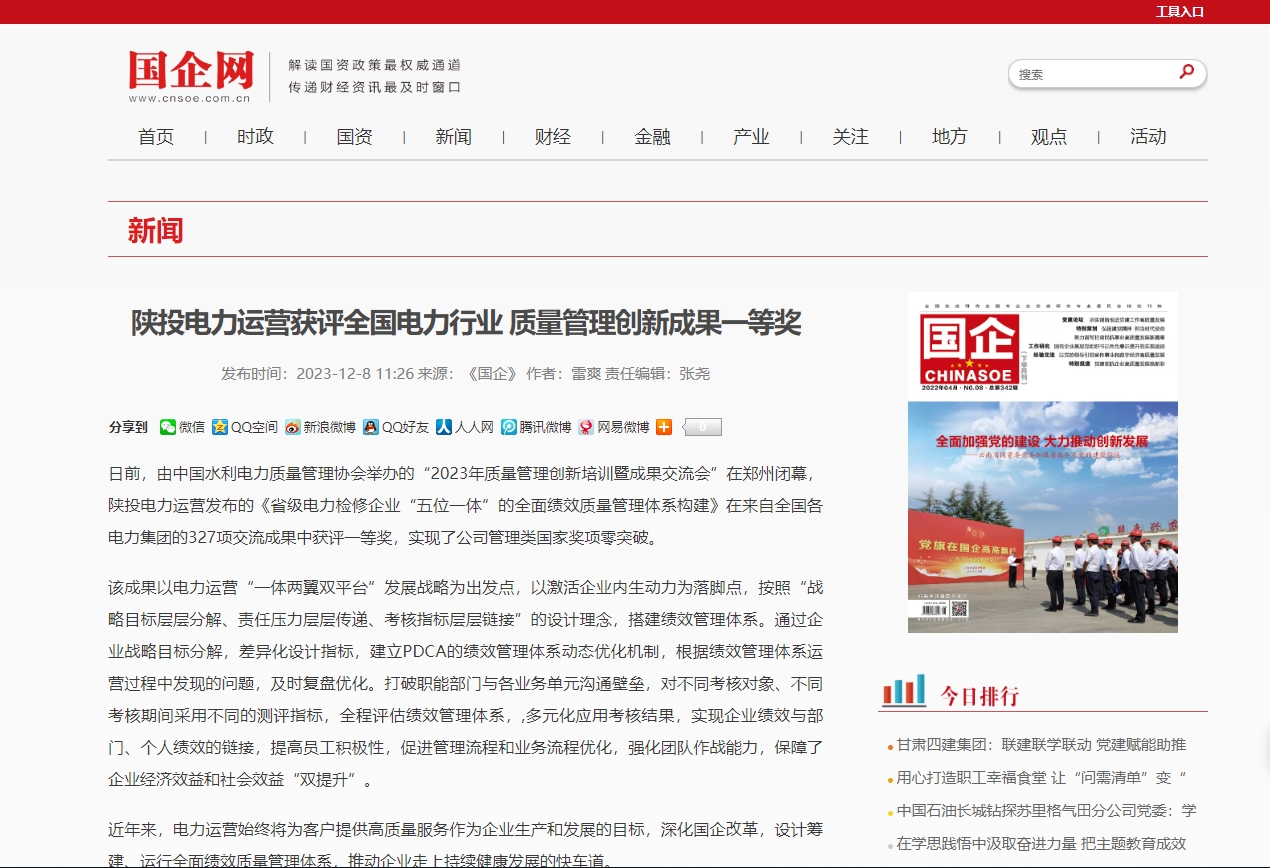 日前,由中国水利电力质量管理协会举办的“2023年质量管理创新培训暨成果交流会”在郑州闭幕,陕投电力运营发布的《省级电力检修企业“五位一体”的全面绩效质量管理体系构建》在来自全国各电力集团的327项交流成果中获评一等奖,实现了公司管理类国家奖项零突破。