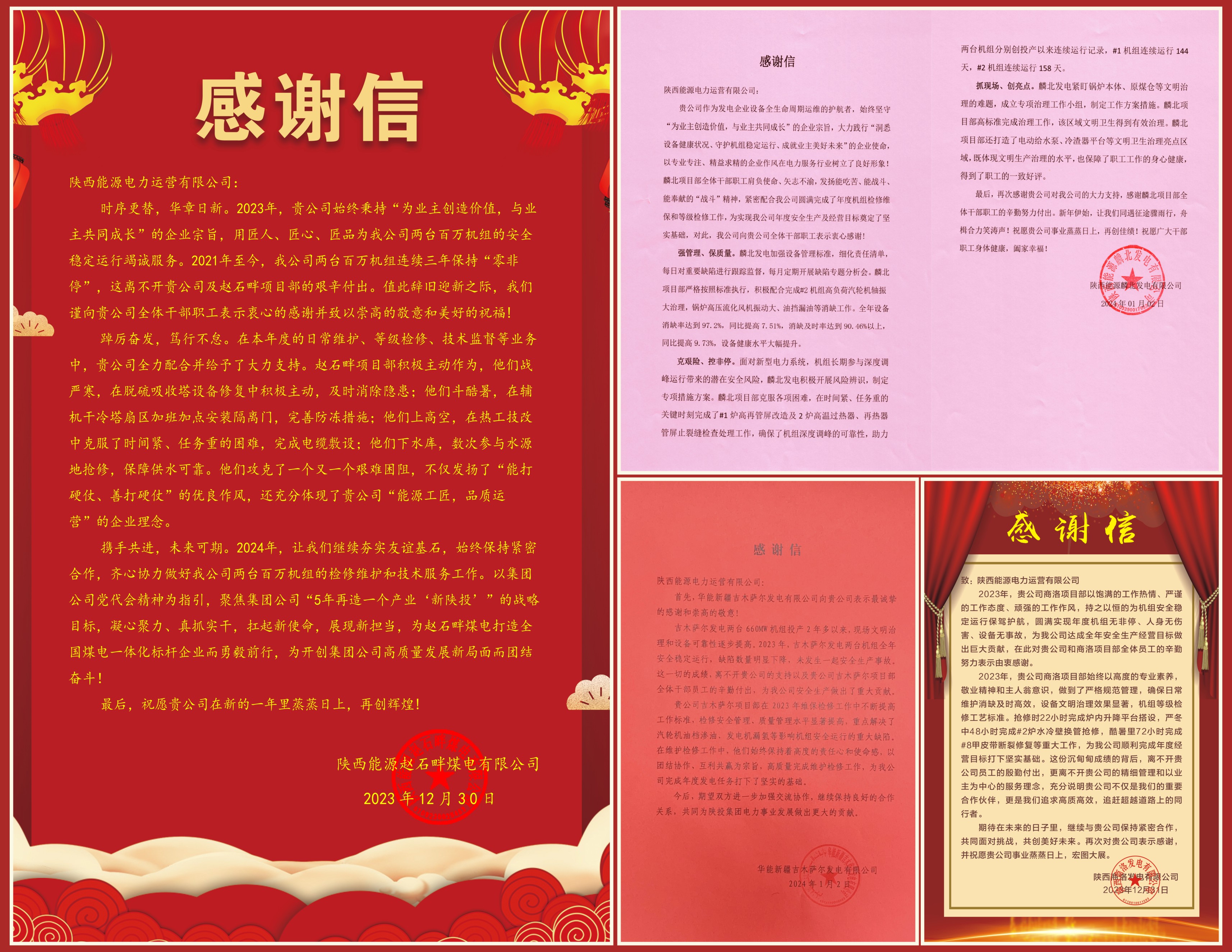 近日,公司连续收到商洛发电、麟北发电、赵石畔煤电、吉木萨尔发电等多家业主单位发来的感谢信,对电力运营各项目部在急难险重工作面前毫不退缩、冲锋在前,圆满完成机组运维检修任务给予高度肯定和赞扬。