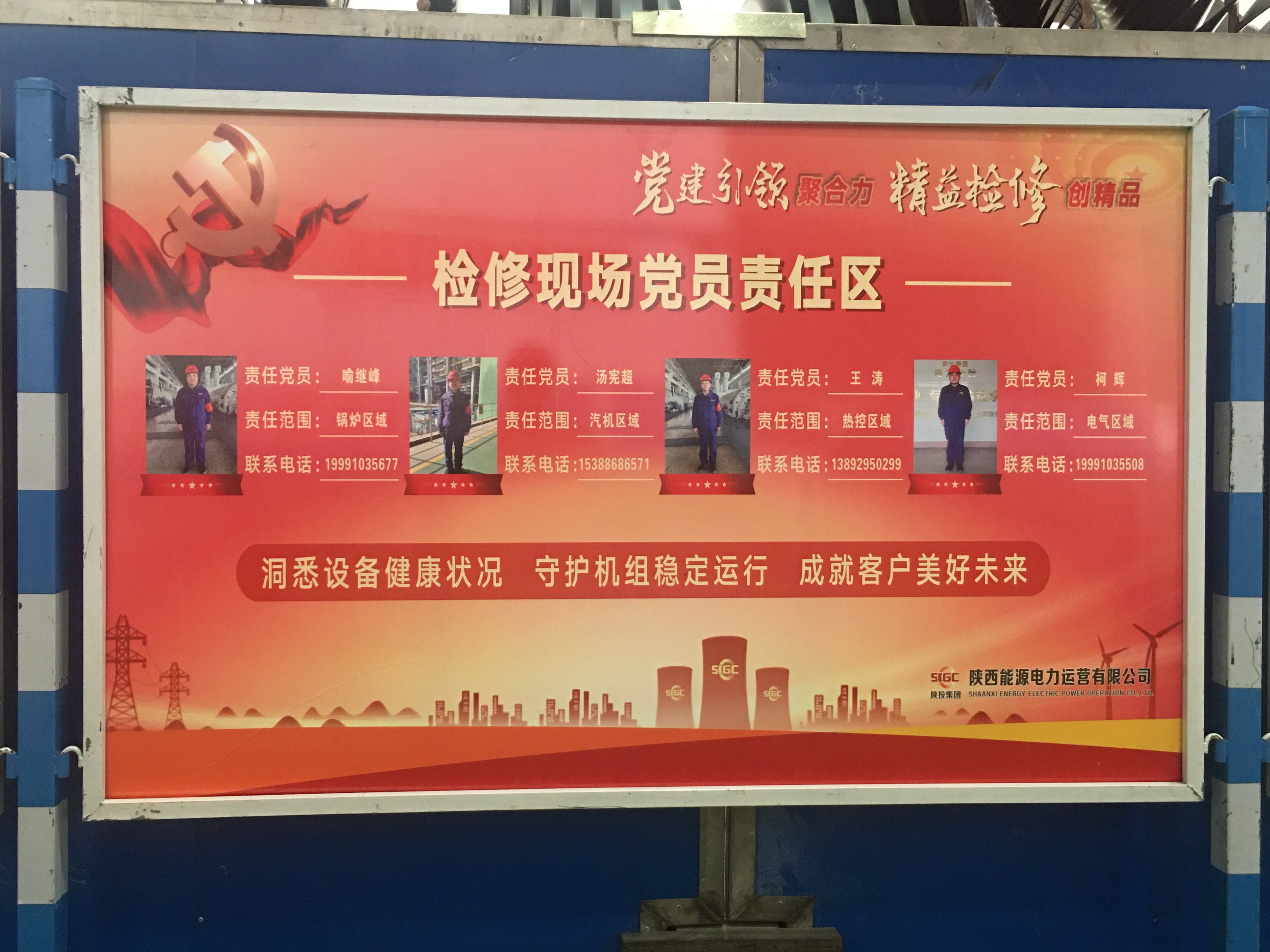 “发挥党员模范带头作用,以身作则按期完成检修任务!”一块块鲜红的“党员责任区”和“党员承诺”展板,真正使党员身份亮出来、作用显出来、形象立起来。