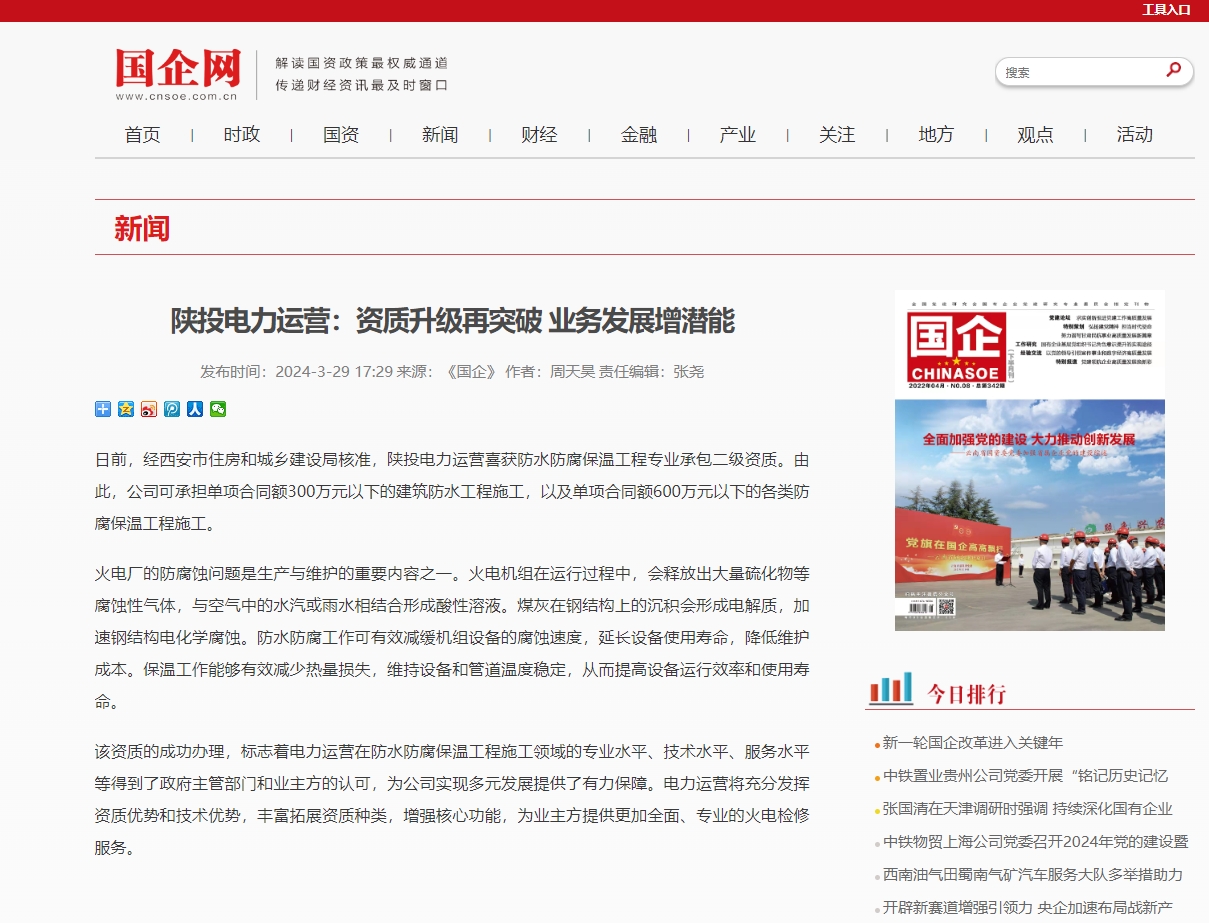 日前,经西安市住房和城乡建设局核准,陕投电力运营喜获防水防腐保温工程专业承包二级资质。由此,公司可承担单项合同额300万元以下的建筑防水工程施工,以及单项合同额600万元以下的各类防腐保温工程施工。