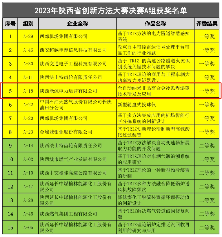 11月5日,公司“全自动纳米非晶高合金冷弧焊熔敷技术研发及应用”创新成果在2023“秦创原·泾河新城杯”陕西省创新方法大赛中斩获一等奖。这是继2022年获得陕西省创新方法大赛一等奖后,公司再次斩获此项殊荣。