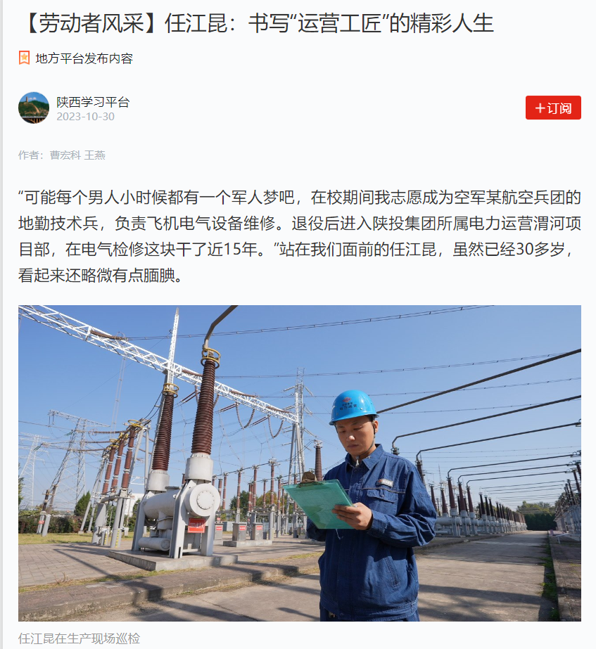 “可能每个男人小时候都有一个军人梦吧,在校期间我志愿成为空军某航空兵团的地勤技术兵,负责飞机电气设备维修。退役后进入电力运营渭河项目部,在电气检修这块干了近15年。”站在我们面前的任江昆,虽然已经30多岁,看起来还略微有点腼腆。