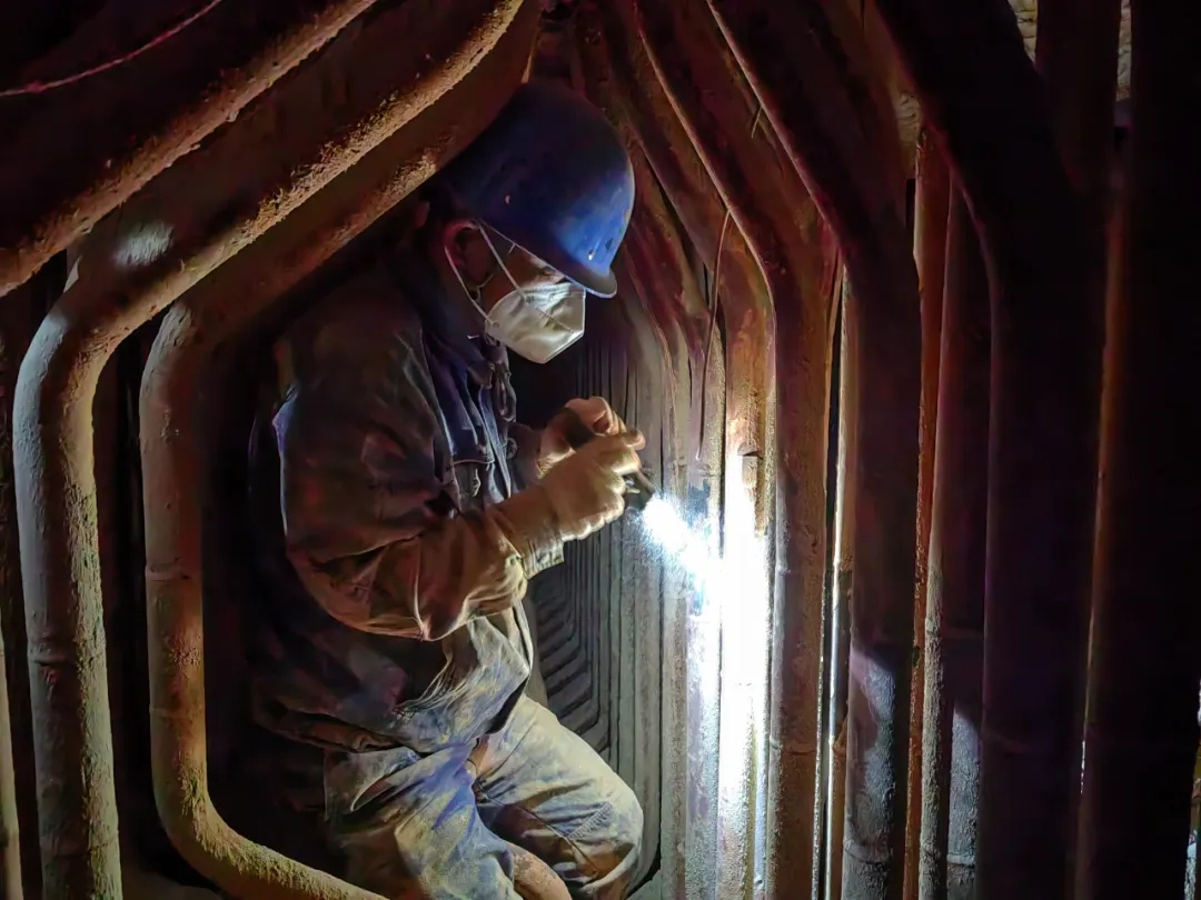 汽包壁温和锅炉大罩壳温度元件是监视超温、泄漏的重要设备,关乎机组安全稳定运行。由于温度元件处在锅炉大罩壳与机箱管排之间,周边管排布置复杂、保温材料多,武朝辉只能带着同事钻进狭小的空间内进行操作。“这地方又闷又热,空间又小,一下子要更换106个‘锅炉体温计’,党员不上谁上!”武朝辉擦着汗,乐呵呵地说道。