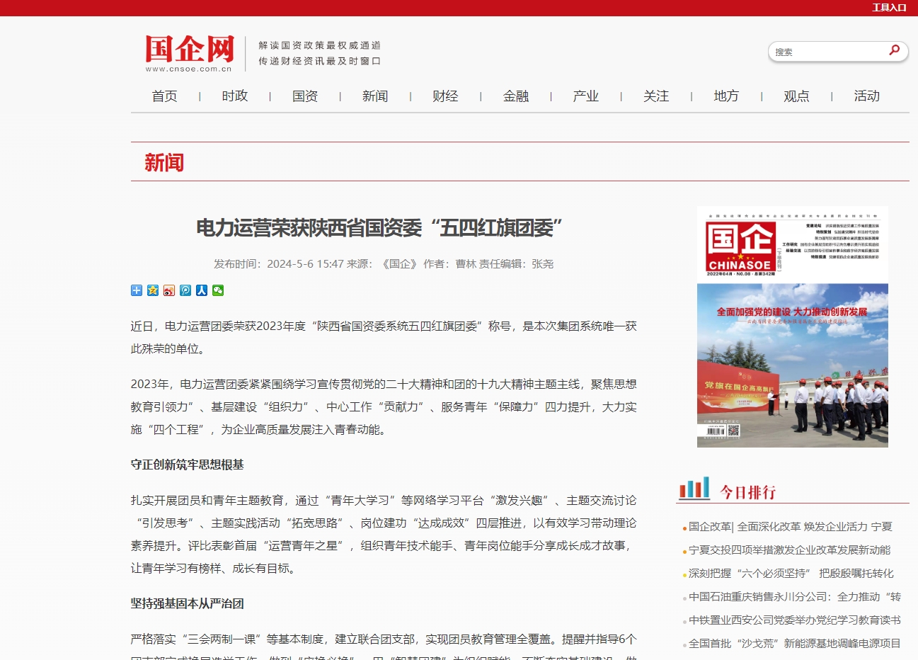 近日,电力运营团委荣获2023年度“陕西省国资委系统五四红旗团委”称号,是本次集团系统唯一获此殊荣的单位。