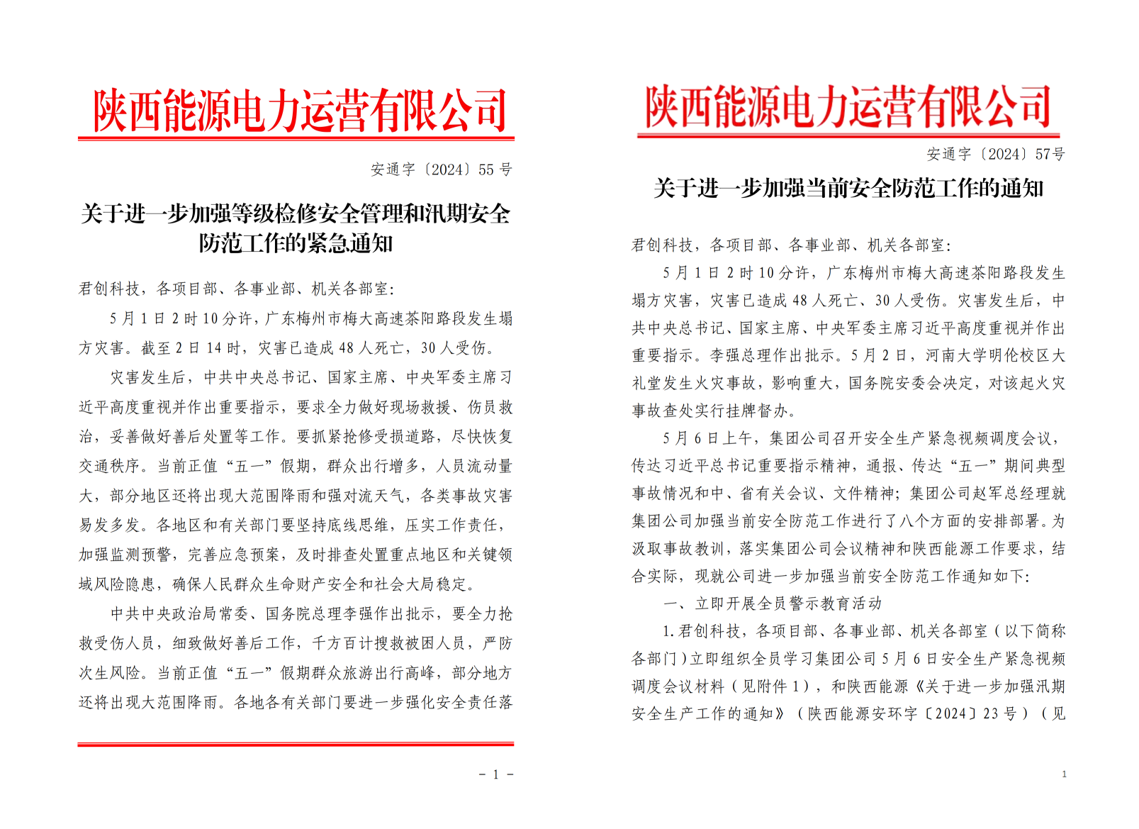 根据陕西能源关于进一步加强等级检修安全管理和汛期安全防范工作的紧急通知要求,公司高度重视,周密安排部署,细化工作措施,于5月3日印发紧急通知,扎实开展汛期安全风险隐患排查工作。集团5月6日安全生产紧急视频调度会议召开后,公司立即响应,印发了《关于进一步加强当前安全防范工作的通知》,深刻汲取广东梅大高速塌方灾害及河南大学礼堂火灾事故教训,深入学习习近平总书记重要指示精神,进一步加强安全生产风险防范工作,深化落实防控措施,深化完善防控体系,坚决遏制各类安全生产事故和社会影响事件发生。