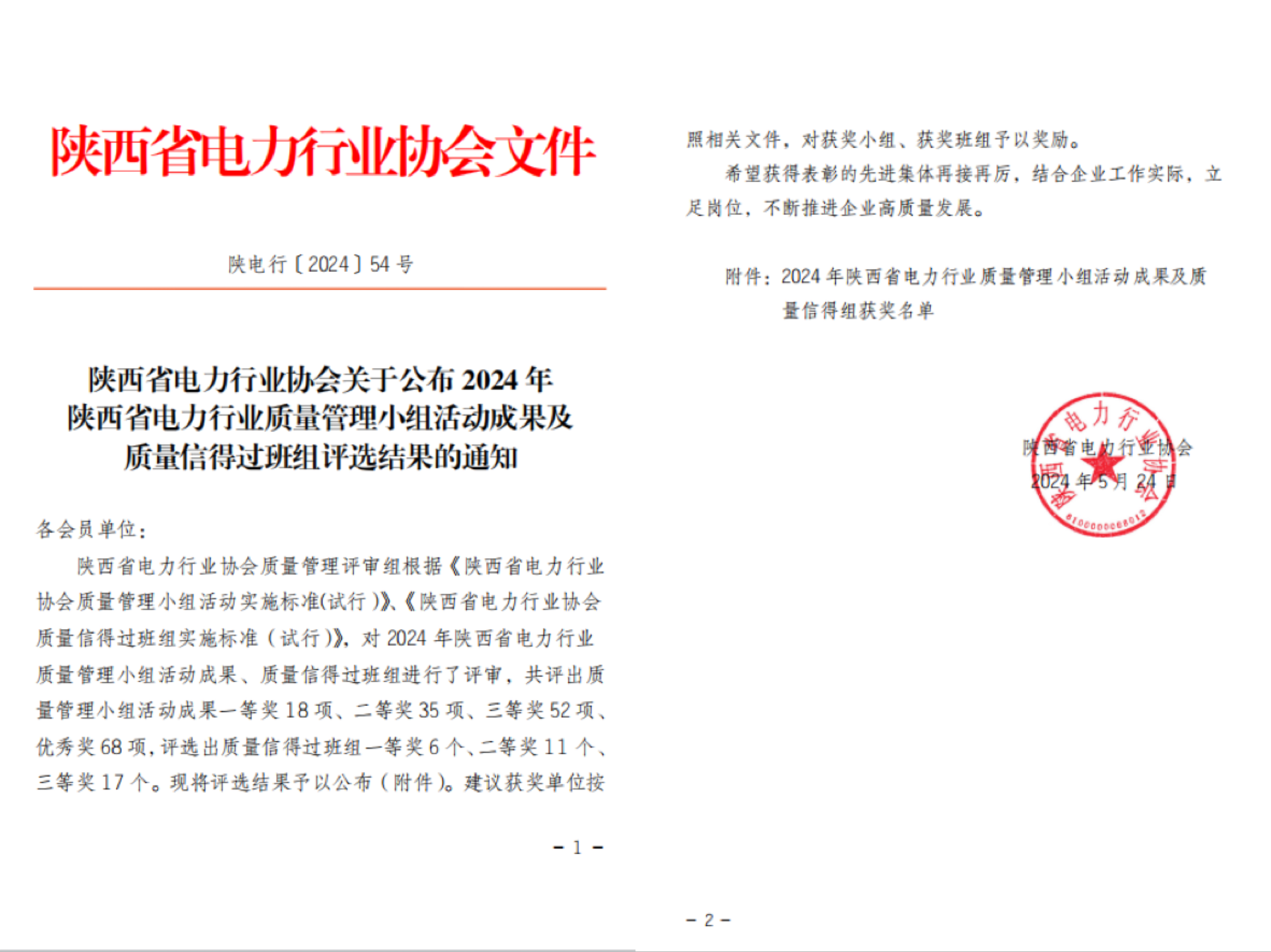 日前,公司《缩短磨煤机液压缸漏油消缺时长》《降低1000MW水氢氢发电机漏氢率》等QC成果荣获陕西省电力行业质量管理小组活动一等奖4个、二等奖1个;君创科技材料专业室荣获省电力行业“质量信得过班组”二等奖,商洛项目部仪电2班、清水川项目部电气2班、麟北项目部汽化水班获三等奖。