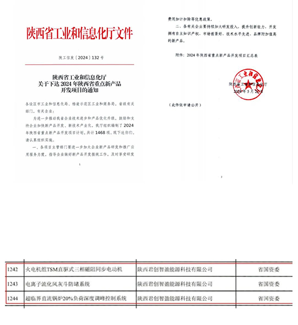 日前,陕西省工信厅发布了《关于下达2024年陕西省重点新产品开发项目的通知》,君创科技《火电机组TSM直驱式三相磁阻同步电动机》《电离子流化风灰斗防堵系统》《超临界直流锅炉20%负荷深度调峰控制系统》等3个项目入选。