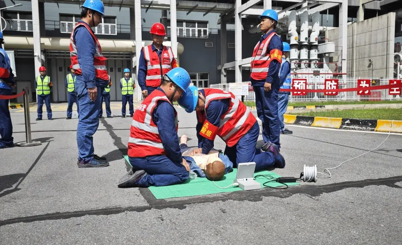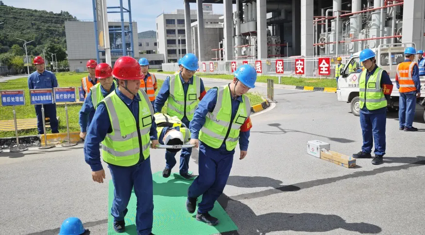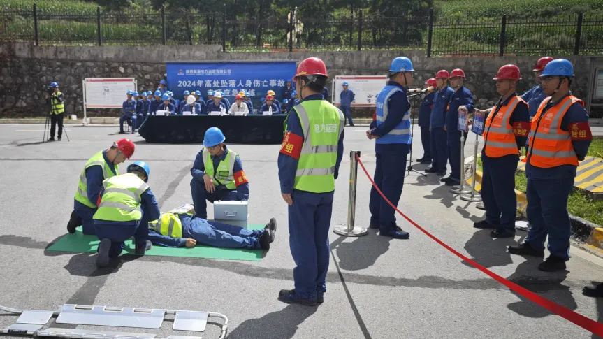本次演练突出“实景、实员、实地、实战”,结合电力检维修作业中人身事故占比最高的高处坠落,实景模拟作业人员攀爬脚手架时发生坠落,导致人员骨折、外伤以及呼吸心跳停止等复杂情况进行应急救援。