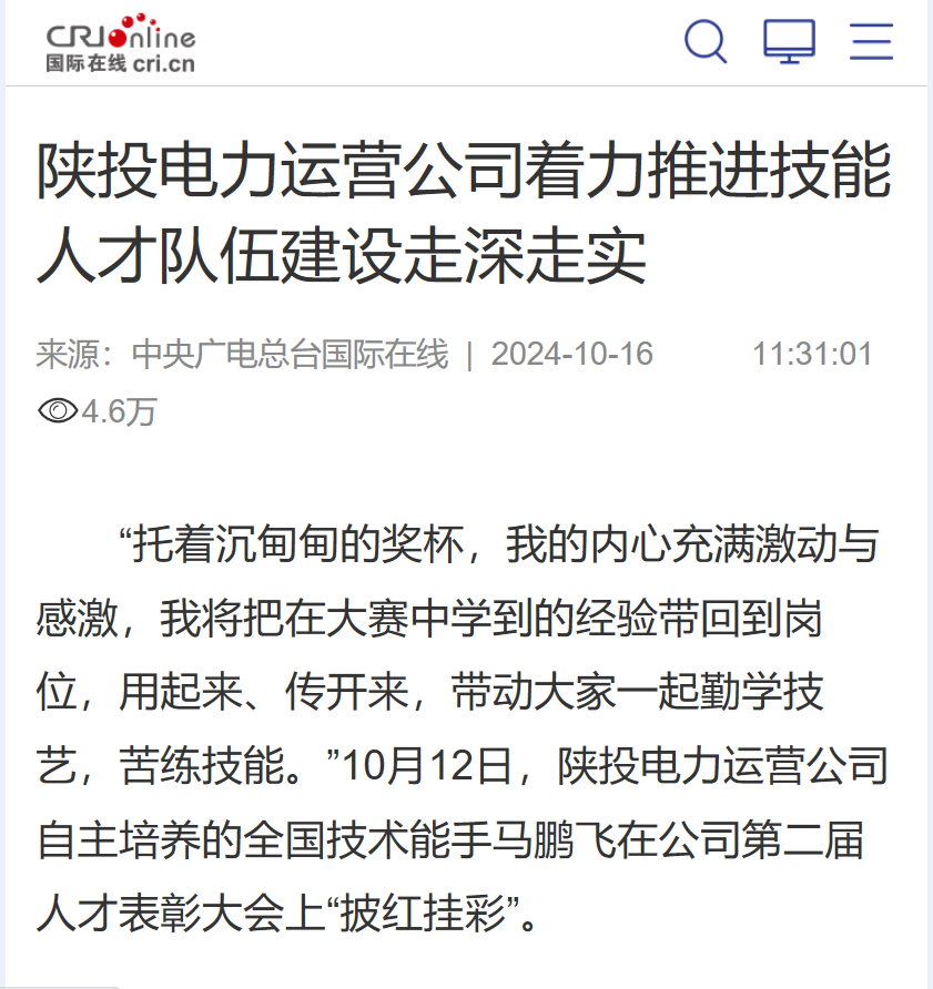 “托着沉甸甸的奖杯,我的内心充满激动与感激,我将把在大赛中学到的经验带回到岗位,用起来、传开来,带动大家一起勤学技艺,苦练技能。”10月12日,陕投电力运营自主培养的全国技术能手马鹏飞在公司第二届人才表彰大会上“披红挂彩”。