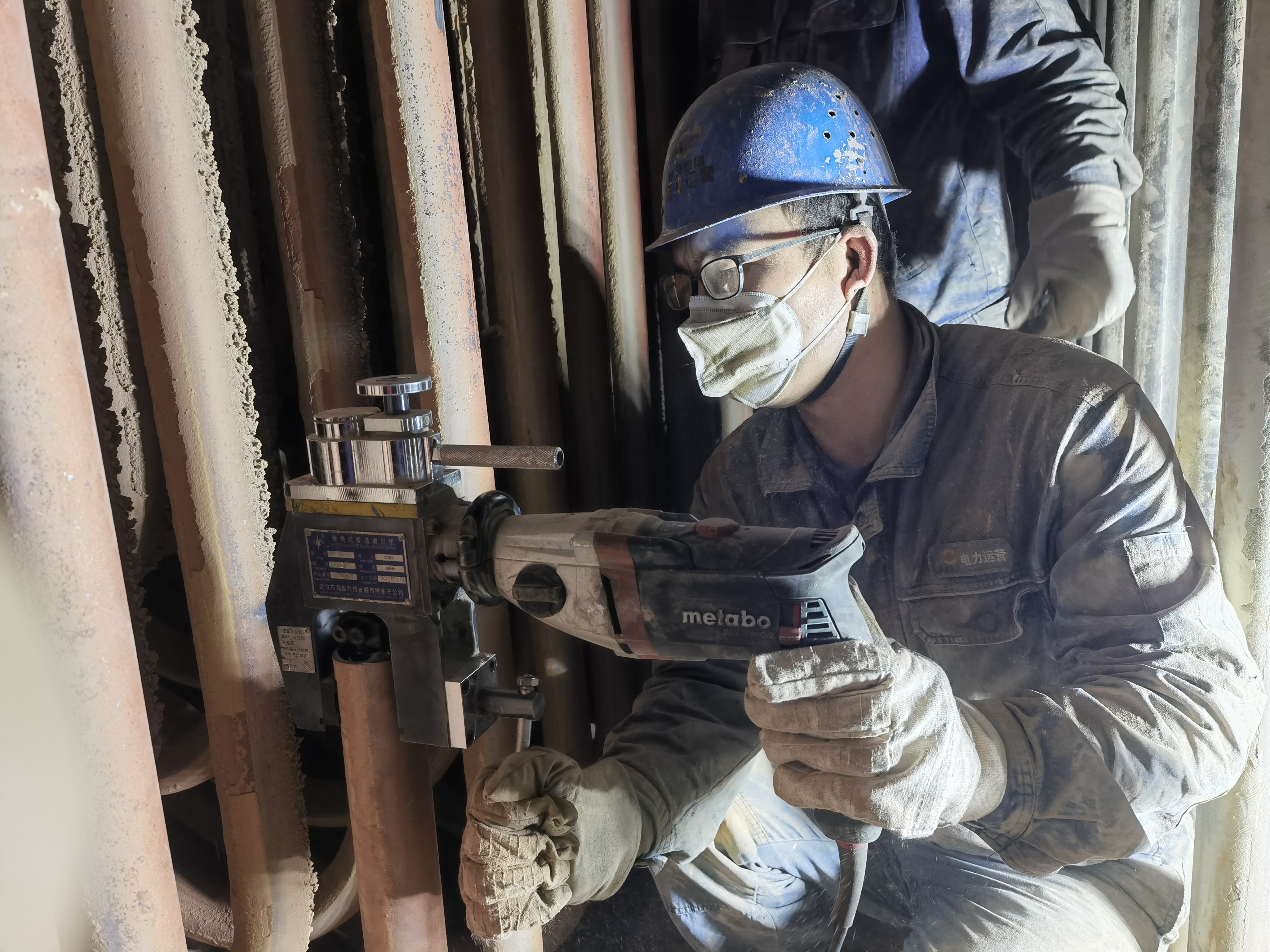 “此次检修要检查水冷壁四面和炉外主蒸汽测点割管,仅#5炉检查焊补打磨点就有600多个,坚决要把好W、H点的验收关,现场验收、现场签字,做到一项都不能少,保证不掉链子。”谈到质量,正在进行锅炉大罩壳大管径管道、三通焊缝磁粉检测的锅炉专业专工刘宏感触颇深。