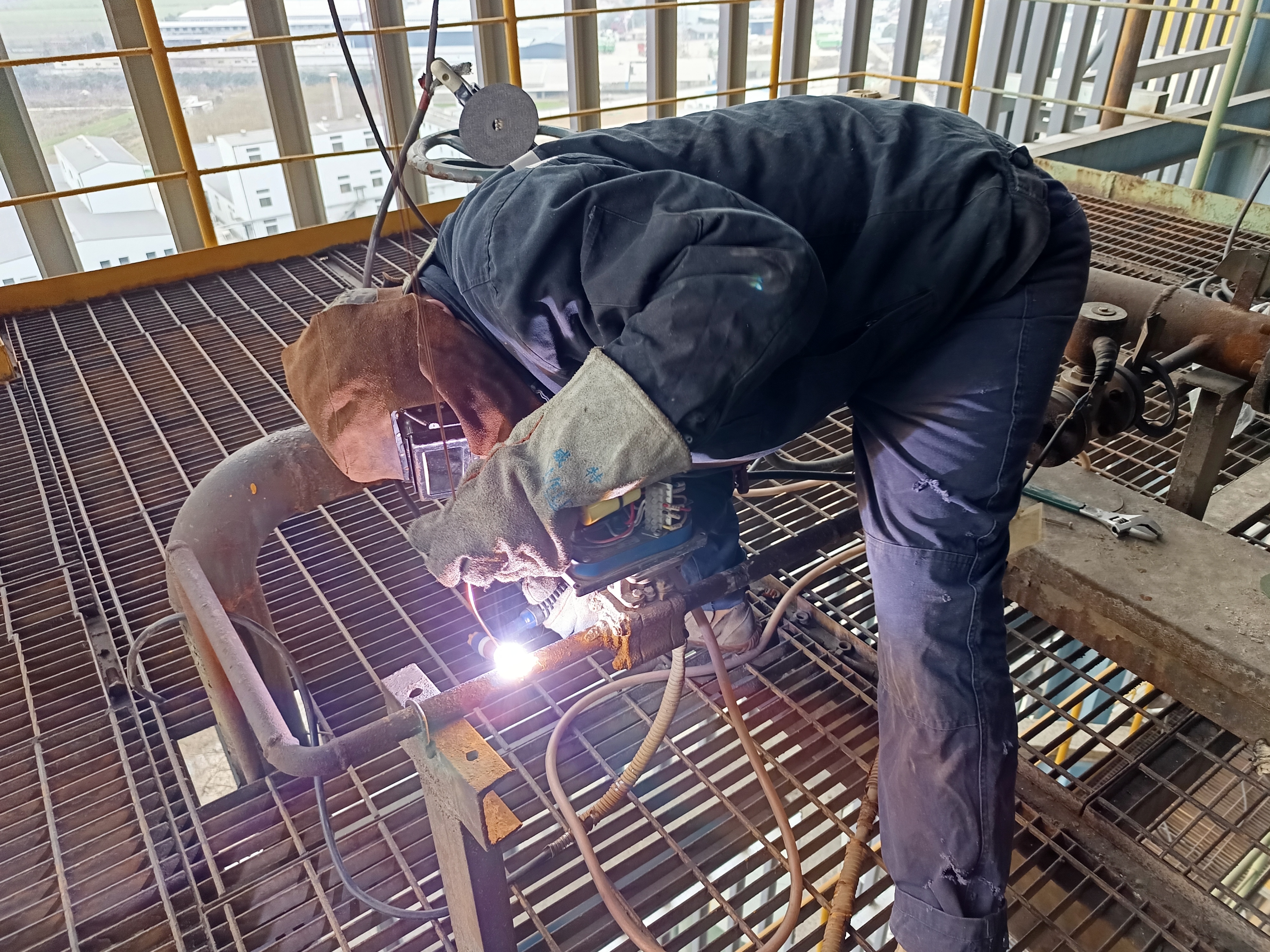 19日16:15,#6炉50米高的吹灰器乙炔管消漏现场,完成压缩空气吹扫、乙炔余气测试等准备工作,“绣花匠”杨建拿起角磨机对焊口进行维护、打磨。