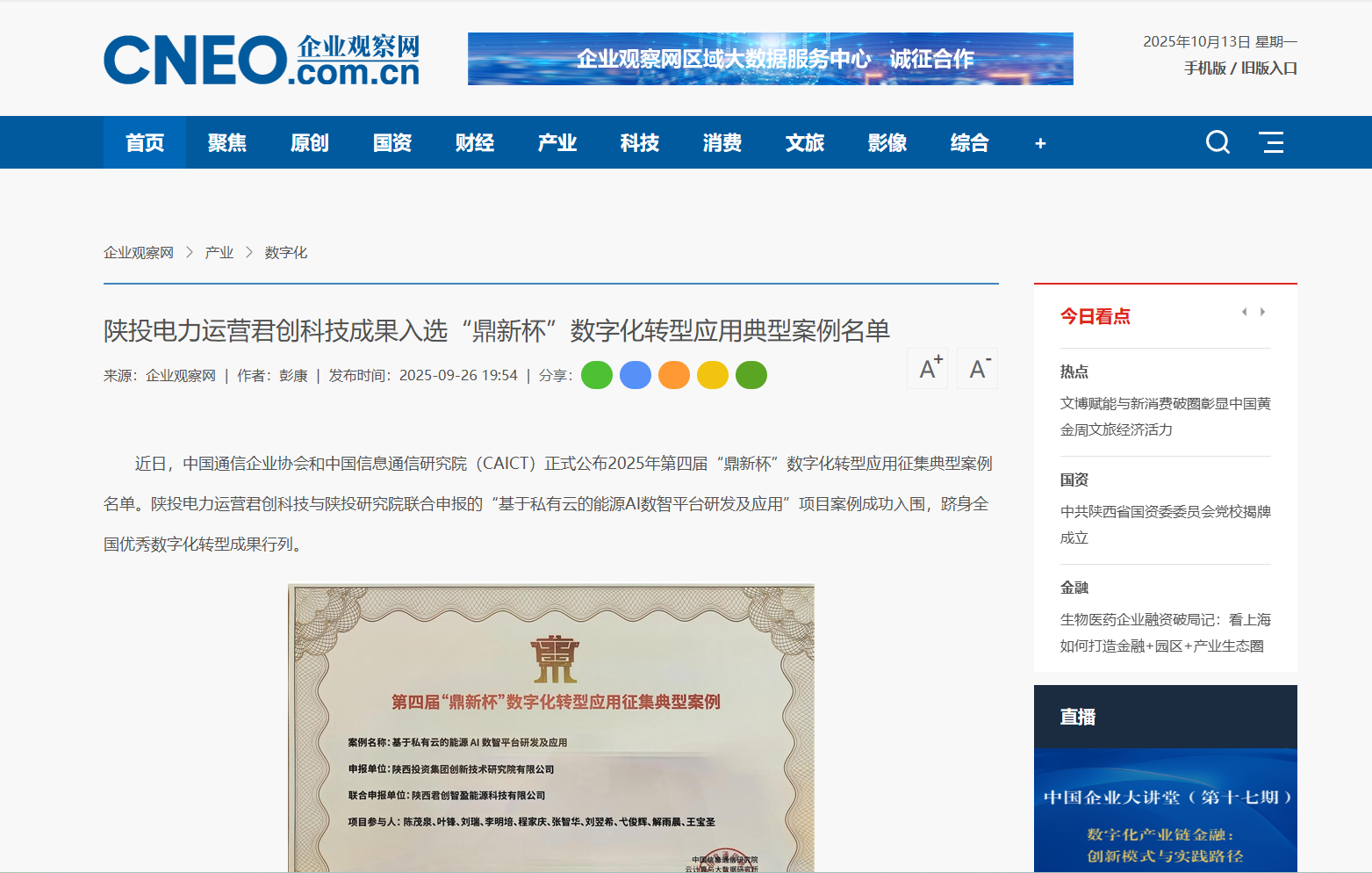 近日,中国通信企业协会和中国信息通信研究院(CAICT)正式公布2025年第四届“鼎新杯”数字化转型应用征集典型案例名单。陕投电力运营君创科技与陕投研究院联合申报的“基于私有云的能源AI数智平台研发及应用”项目案例成功入围,跻身全国优秀数字化转型成果行列。