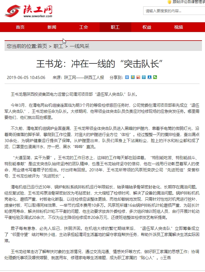 今年3月,在渭电两台机组接连面临为期3个月的等级检修艰巨任务时,公司党委在渭河项目部率先成立“退伍军人突击队”,王书龙被任命为队长。大修期间,他带领全体突击队员负责应对检修现场的应急突发任务。哪里需要他们,他们就出现在哪里。