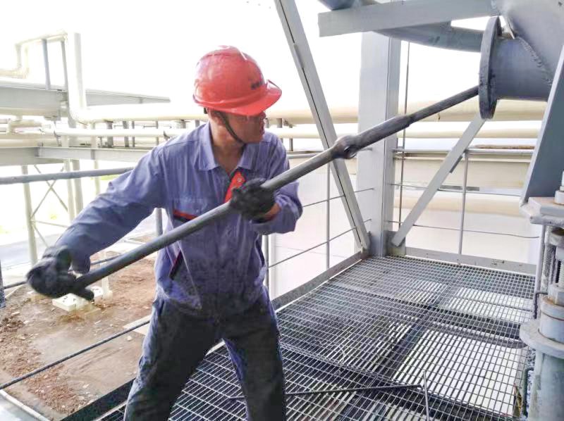 这一刻,工作组成员也士气高涨、干劲十足,很快下部炉渣清理掉了。全体人员又爬到渣仓顶部,打开人孔进行冲洗,在振打器的配合下,大堆的炉渣从排渣口流出。最终,经过三个多小时的紧急处理,#1炉捞渣机渣仓终于彻底疏通。