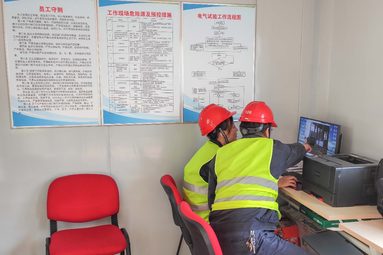 现场文明作业方面,结合公司精细化管理要求,施工现场绘制了详细的“五牌一图”,从工器具摆放、员工守则设置、现场危险源及预控措施制定,到电气试验工作流程等作业标准化执行,均严格各项管理制度进行。