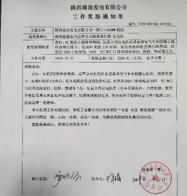 11月6日,商洛项目部收到商洛发电工作奖励5000元,以表彰仪电队在近期加班加点完成#1机组159台电机,#2机组10kV2段母线修检和预试等工作。这是今年以来,项目部继锅炉班顺利完工脱硫系统改造管道,奖励5000元;汽化水班如期完成#1机组主汽阀、调阀解体,奖励3000元;锅炉班副班长李海峰发现#2炉螺旋水冷壁泄露重大缺陷,奖励个人2000元后,收到的第四笔业主方工作奖励。