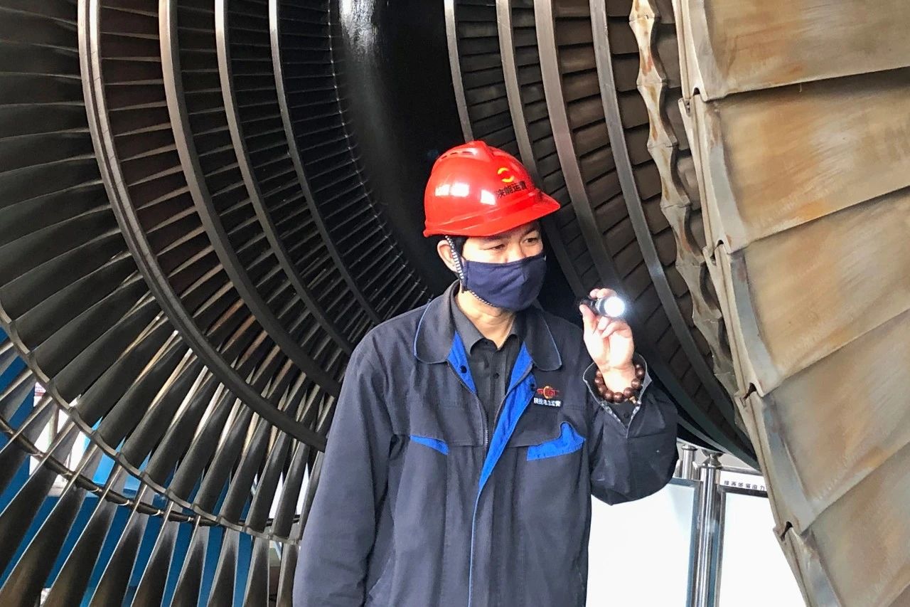 3月13日,渭河项目部机务队主机班詹泾永在检查汽轮机叶片