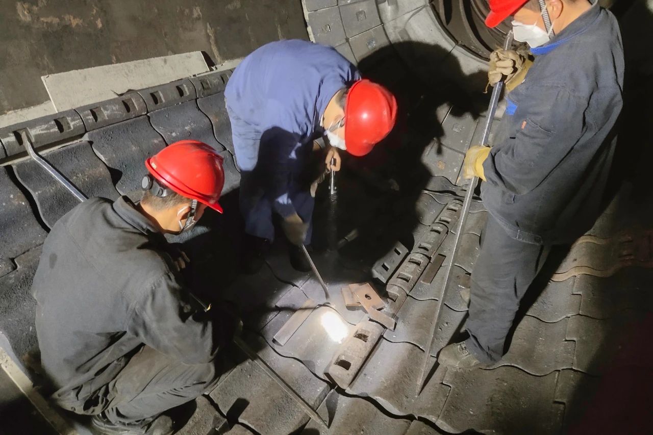 锅炉工作现场,制粉班正在磨煤机钢甲的安装工作。工作人员先将每块重达60多公斤的钢甲按单双型号摆放在石棉板上,再用撬杠调整水平度与垂直度,然后敲击大锤拧紧楔铁、操作气动扳手锁紧螺母。整个过程需要检修人员紧密配合,使单双型号钢甲咬合于楔铁上,不能有丝毫误差。就在这样的工序下,制粉班的一群壮汉们以“绣花”功夫,完成了384块罐体钢甲和64块端部钢甲的安装工作。