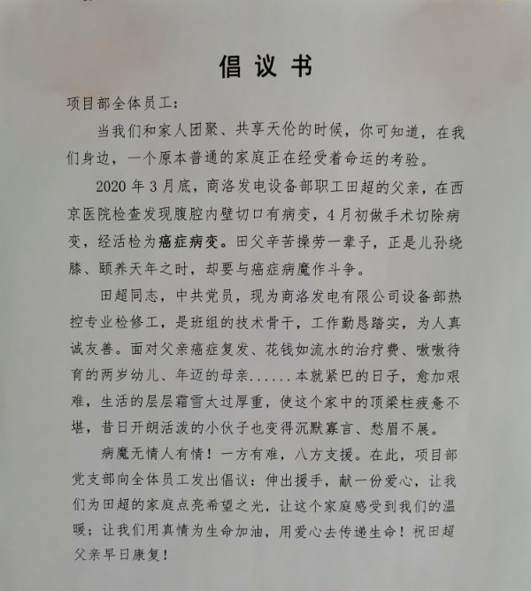 近日,商洛发电设备部职工田超的父亲因患癌症入院治疗。闻知消息后,立即向全体职工发出捐款倡议,大家伸出援助之手,纷纷慷慨解囊,积极踊跃捐款,以实际行动表达电力运营对兄弟单位员工的关爱。