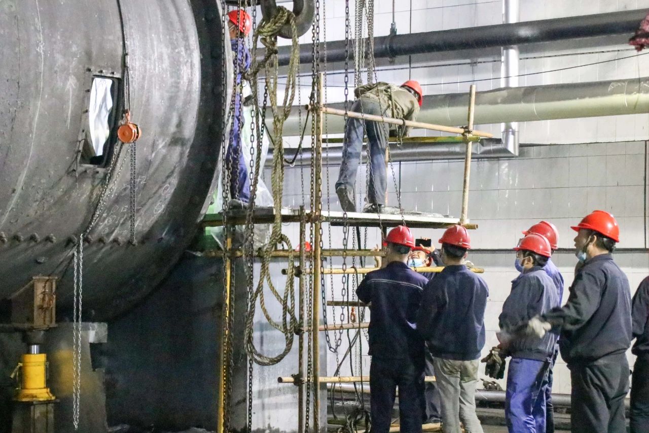截止目前,经过全体人员7个昼夜的奋战,钳工、焊工、起重工多工种的紧密配合,磨煤机罐体已顶起,端盖拆除工作正在紧张有序地进行。
