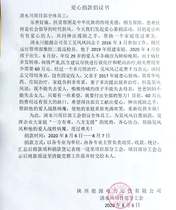 近日,在得知清水川能源职工吴风风爱人不幸身染重病,目前在医院治疗,费用仍有很大缺口的消息后,清水川项目部分工会立即向全体职工发出倡议,号召大家发扬互助、关爱的精神,伸出手来帮助吴风风和家人战胜病魔,渡过难关!
