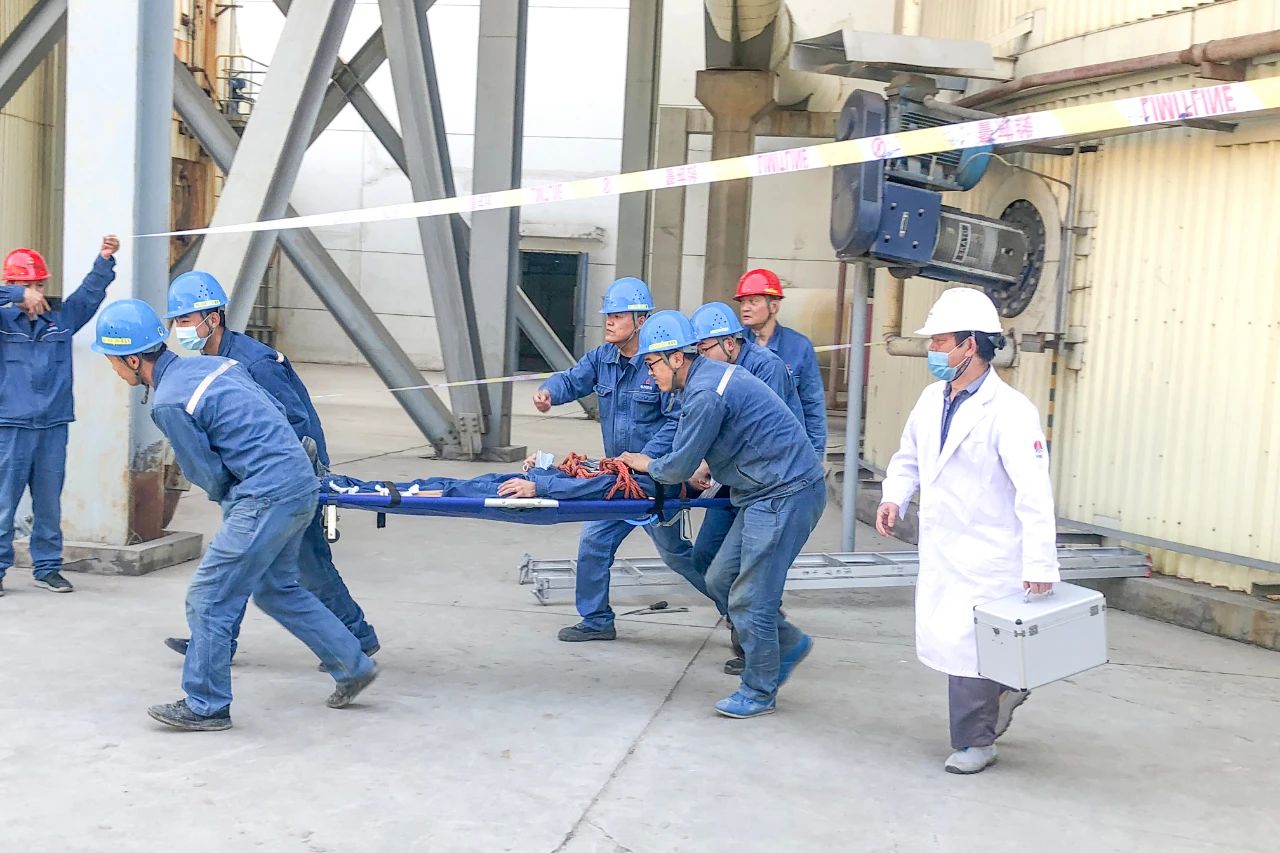 演练以工作人员在#3炉吸收塔阀门作业时发生事故为内容展开。事故发生后,项目部立即启动应急救援预案,对事故进行急救处理,对现场进行警戒隔离。应急救援小组在专人的引导下迅速进入现场,对伤者进行止血、腿部固定后,立即将其抬上救护车,紧急送往医院。